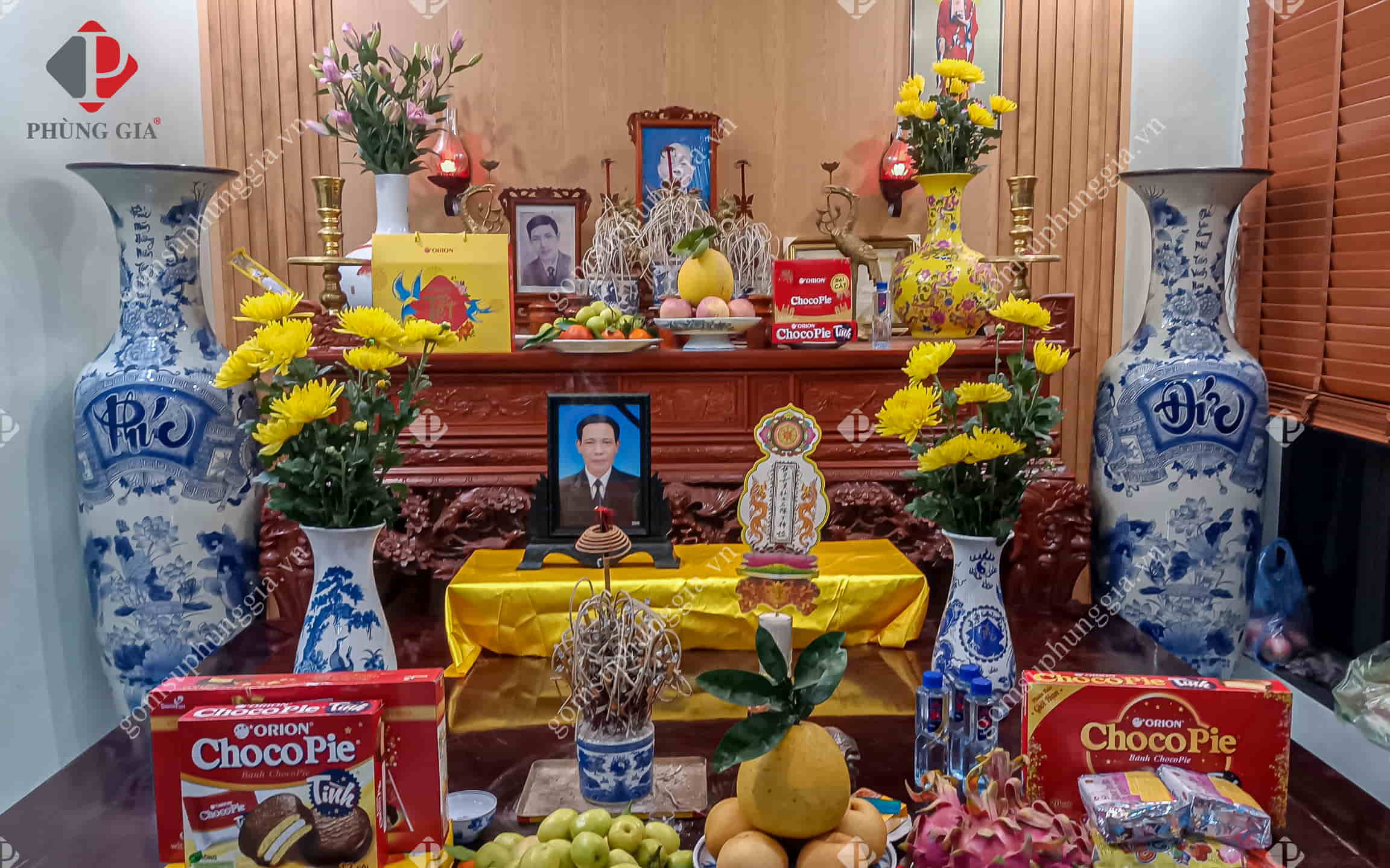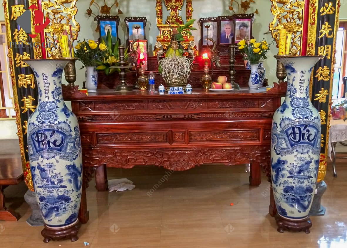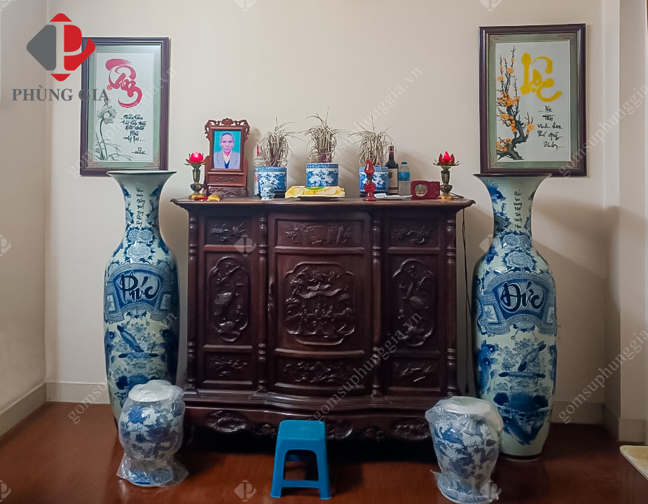 Lộc bình Cuốn thư Phúc Đức 1m6 bày phía trước ban thờ ngang 2m17.