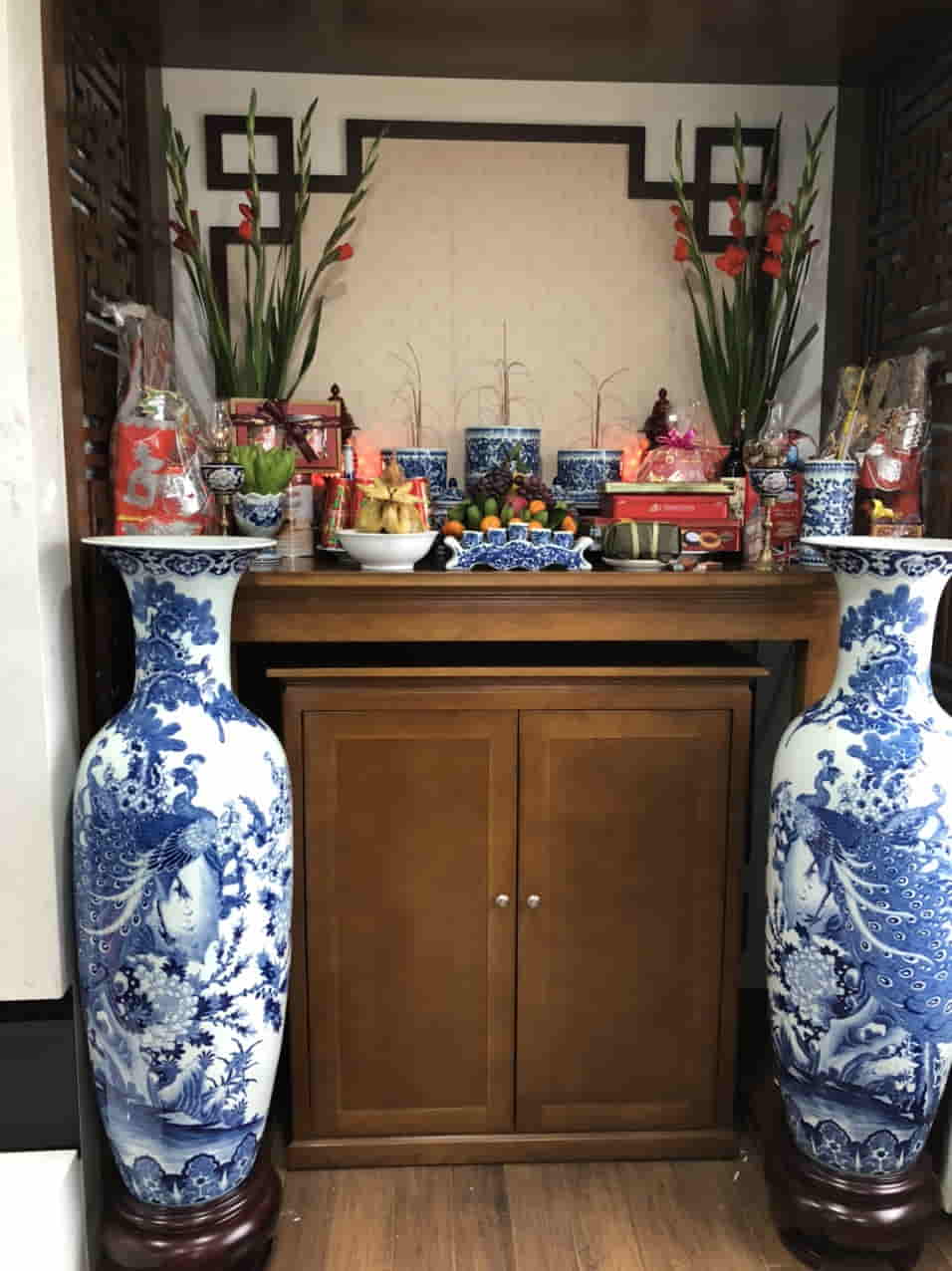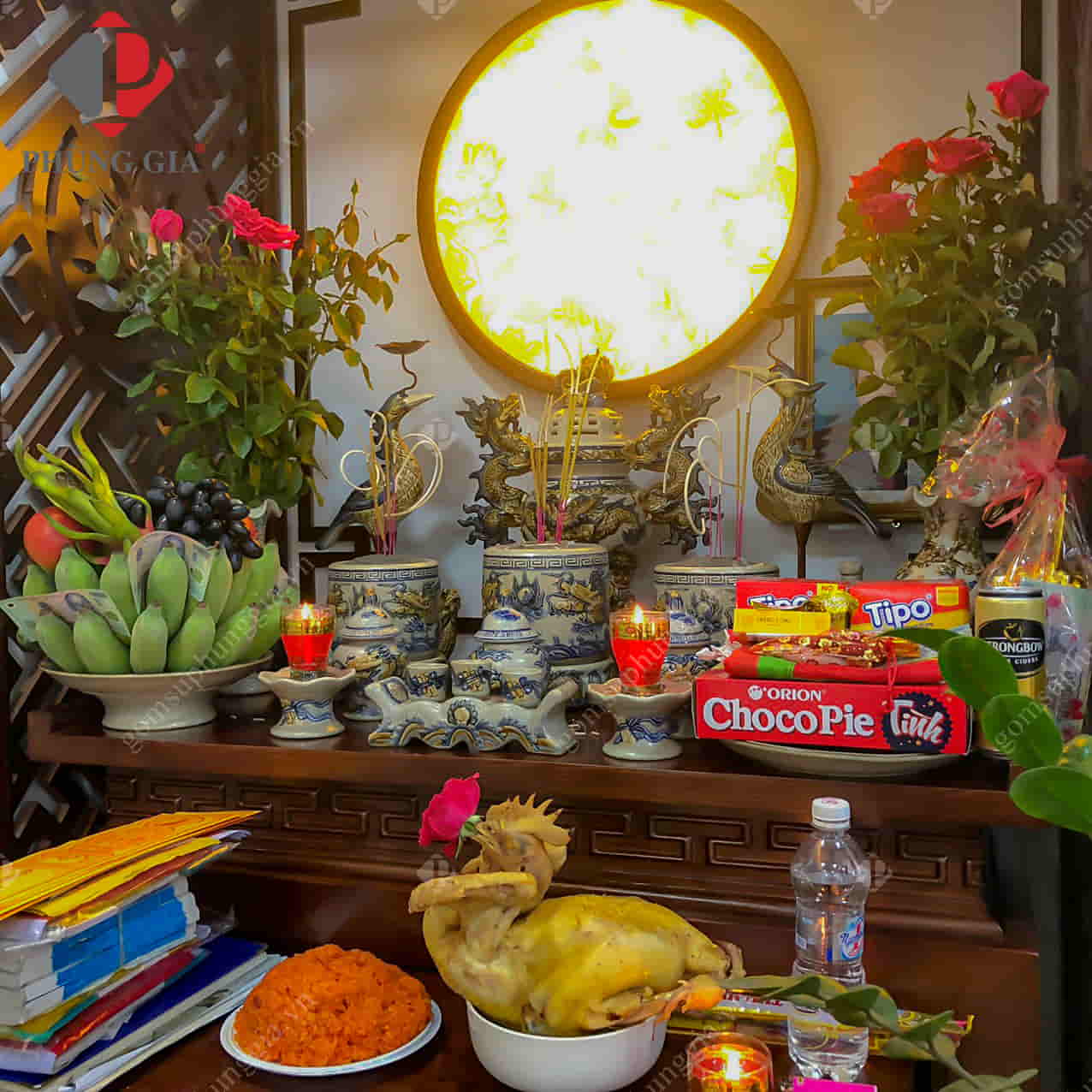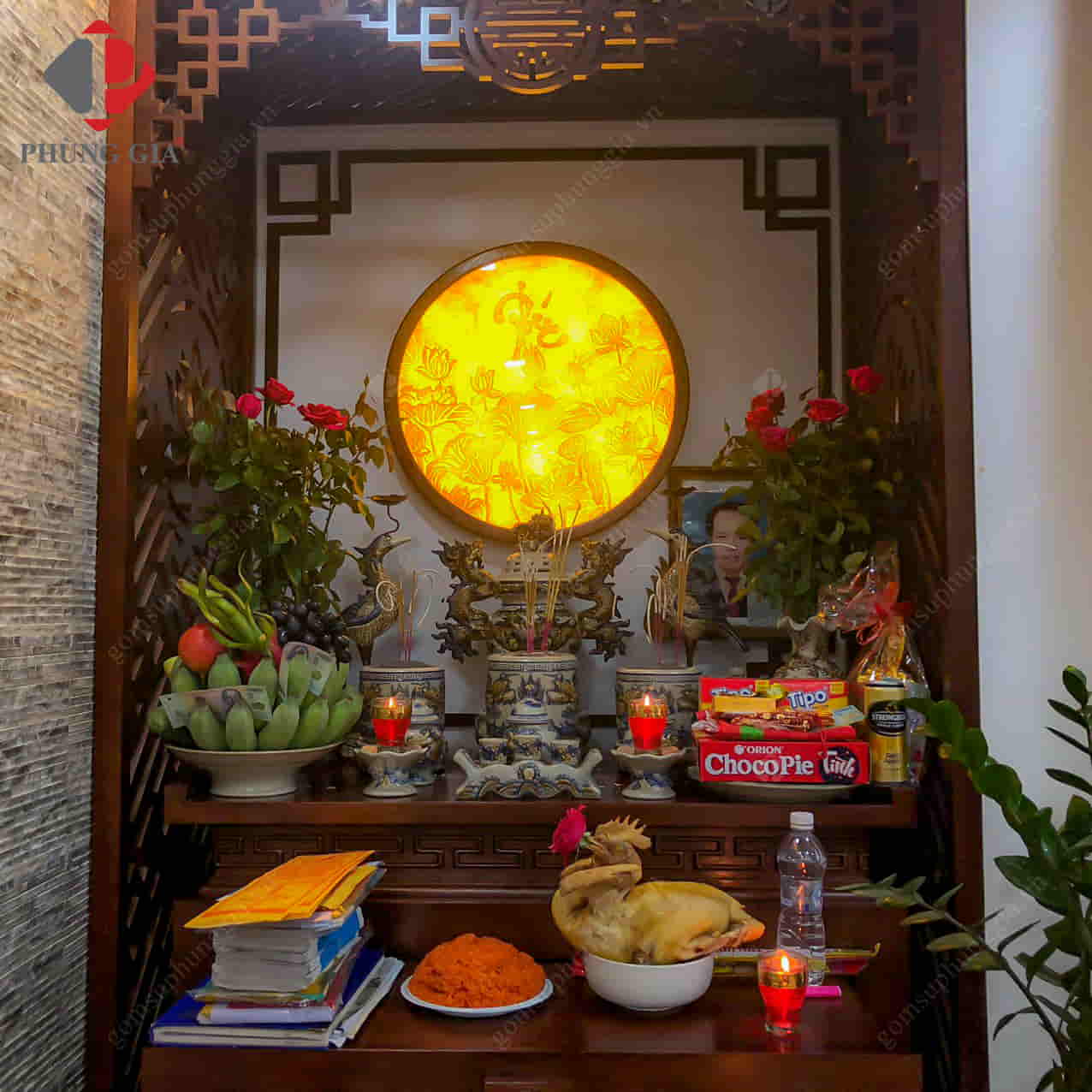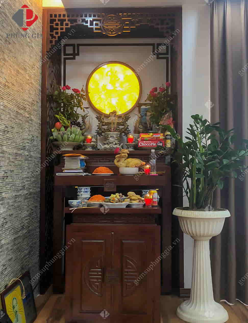 Quý khách có thể tham khảo thêm một số hình ảnh bộ đồ thờ dành cho ban thờ nhà chung cư của khách hàng Phùng Gia.
