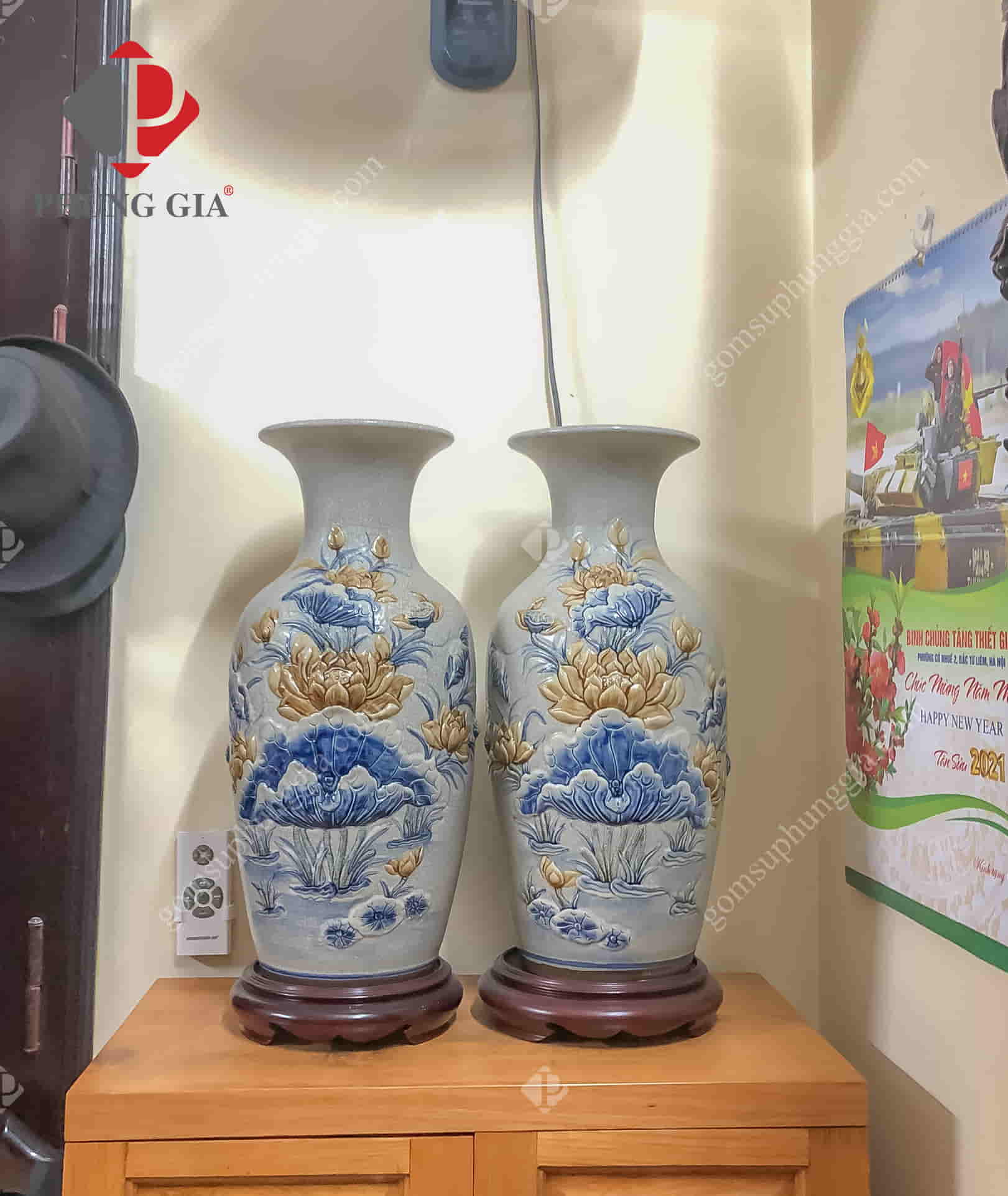 Tiểu lộc bình men hoạ tiết đắp nổi thủ công hoa sen tinh tế và ấm cúng.