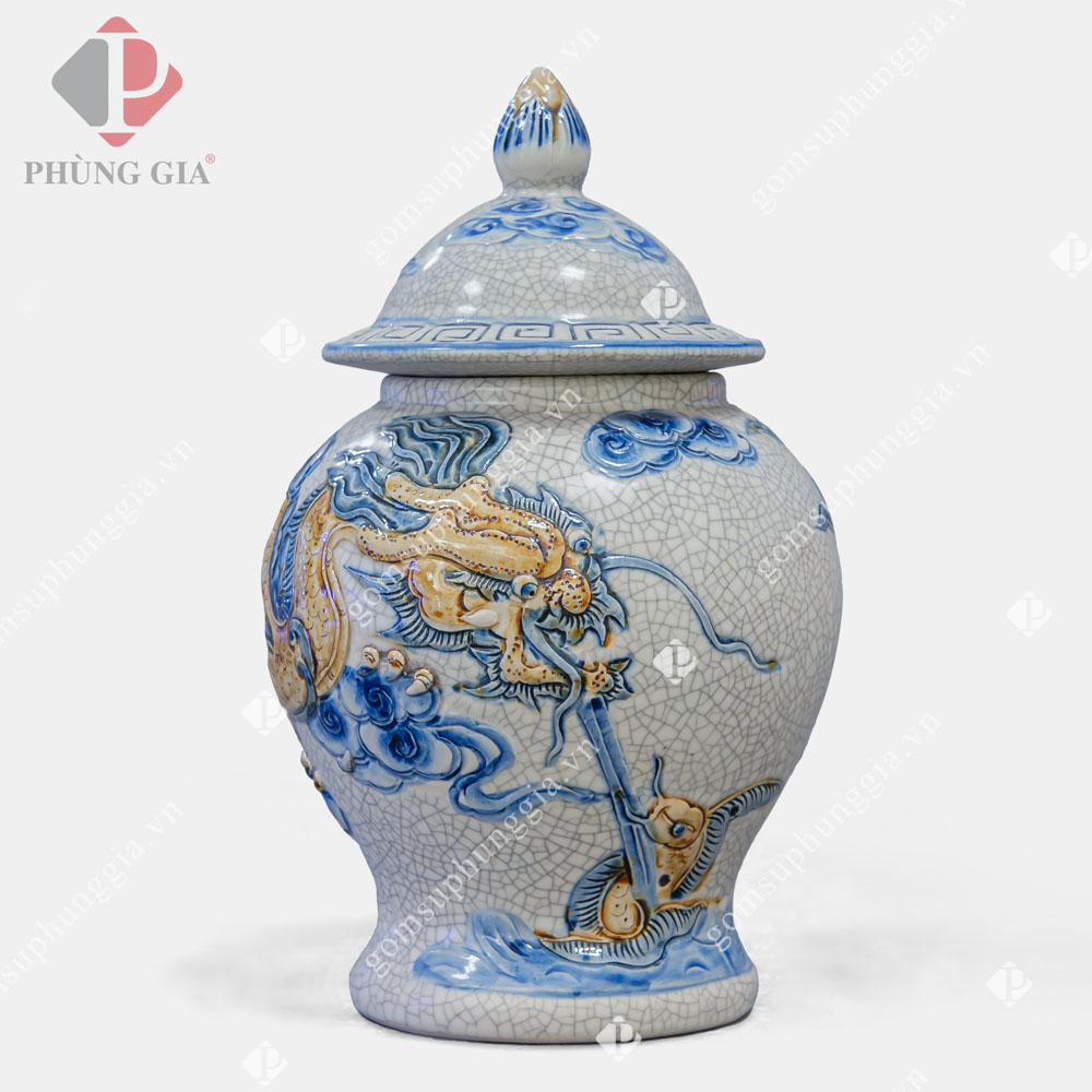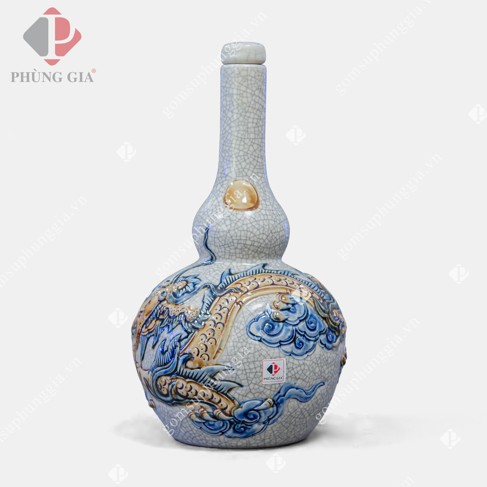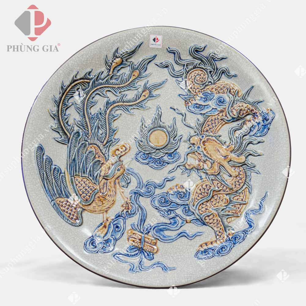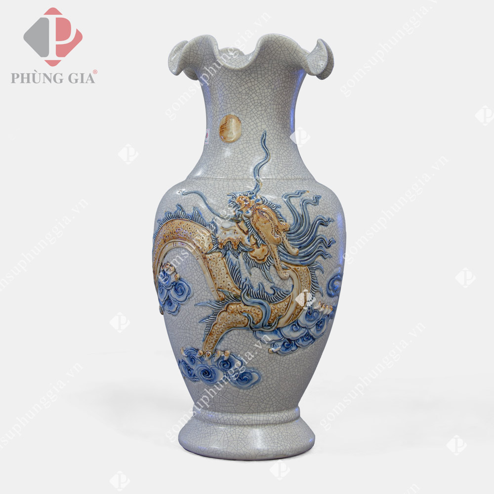 - Các hoa văn họa tiết như hình rồng, phượng, hoa, mây, sóng thủy ba, … được đắp nổi hoặc khắc chìm trên nền men rạn để tạo ra sản phẩm. Thông thường các hoa văn này được vẽ lên bởi 1 số loại men khác như men ngọc, men nâu, … Sự kết hợp giữa các dòng men được người thợ Phùng Gia sử dụng nhuần nhuyễn và cho ra lò những sản phẩm có tính thẩm mỹ cao, đáp ứng nhu cầu của khách hàng.