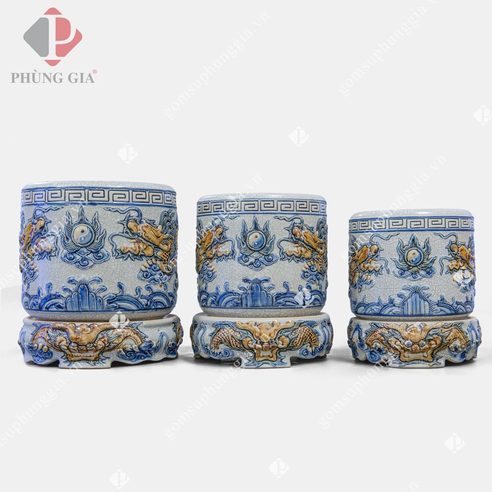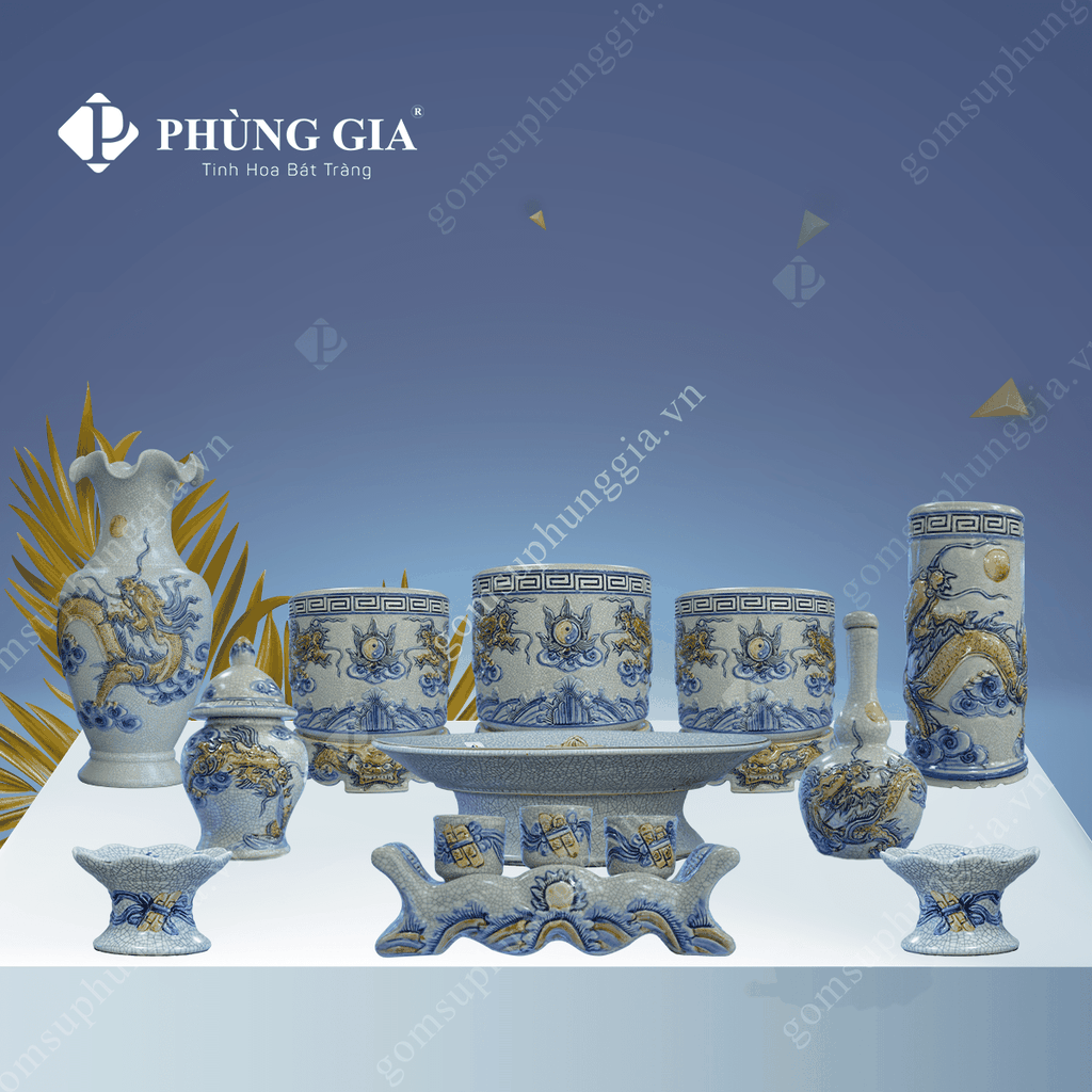Bộ đồ thờ men rạn đắp nổi tại tư gia khách hàng Phùng Gia.
