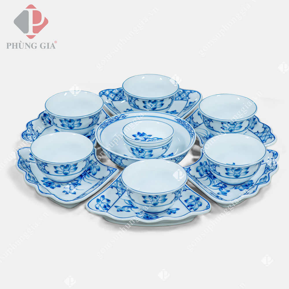 Bộ bát đĩa 15 món, vẽ tay hoạ tiết hoa sen