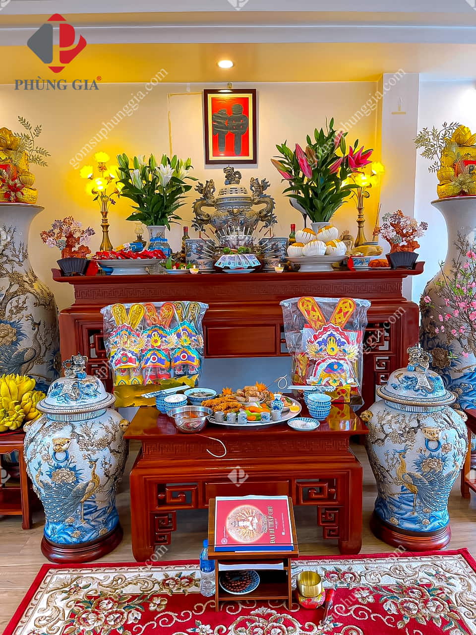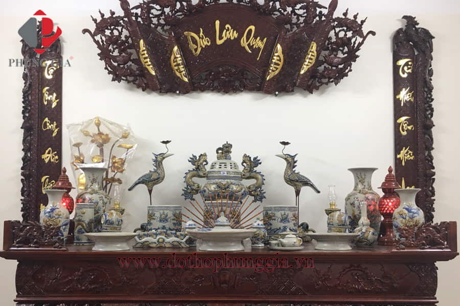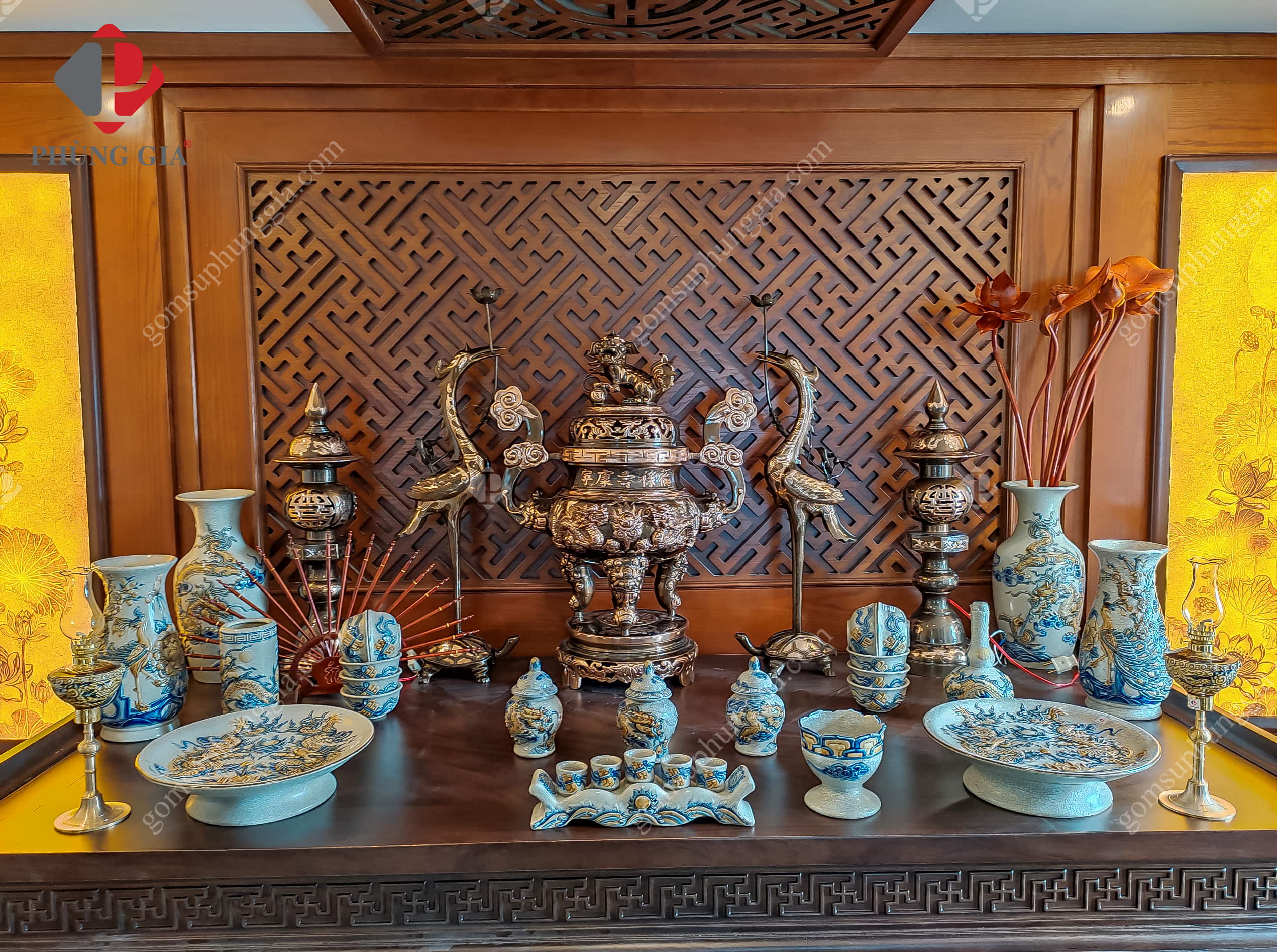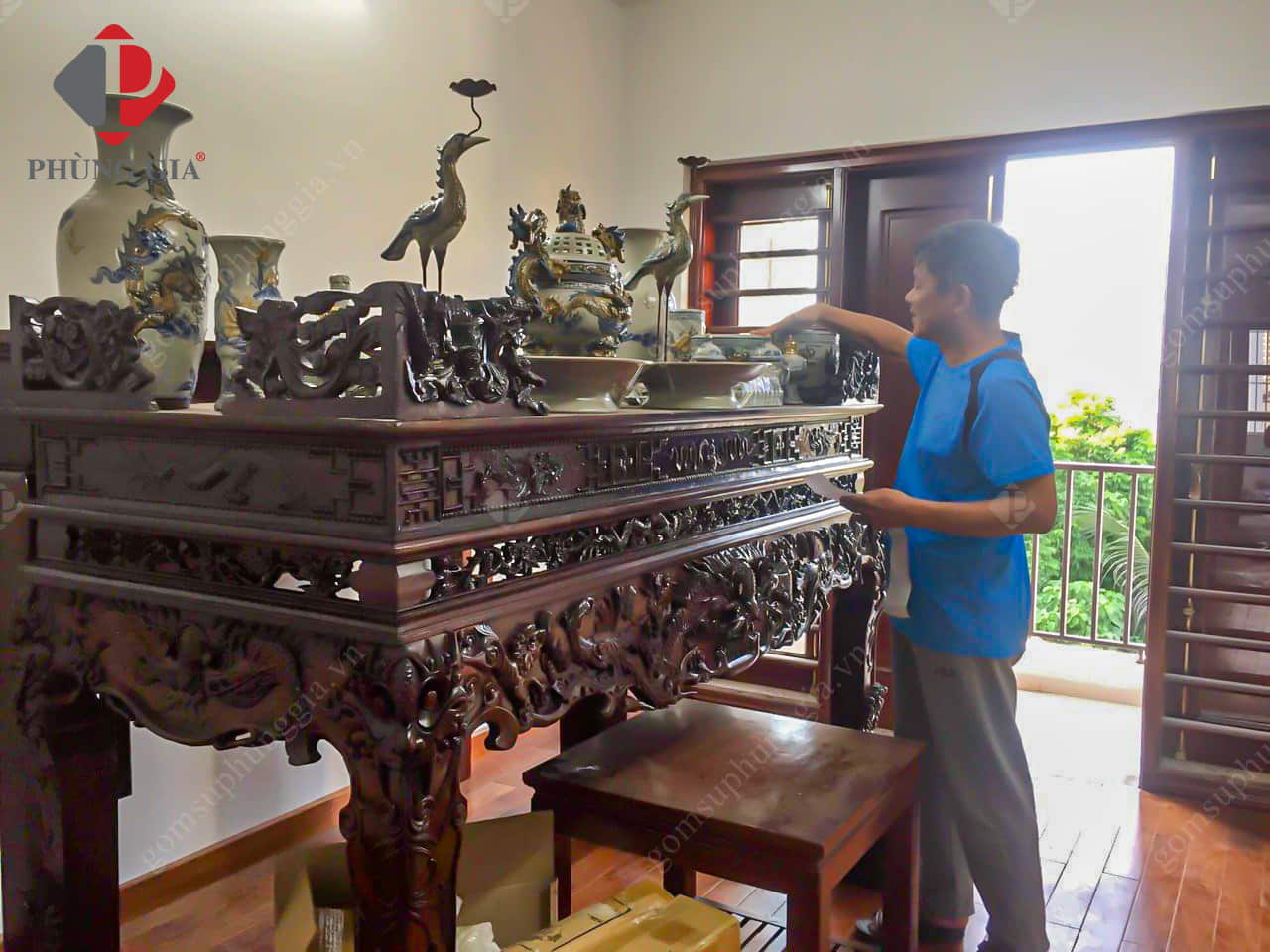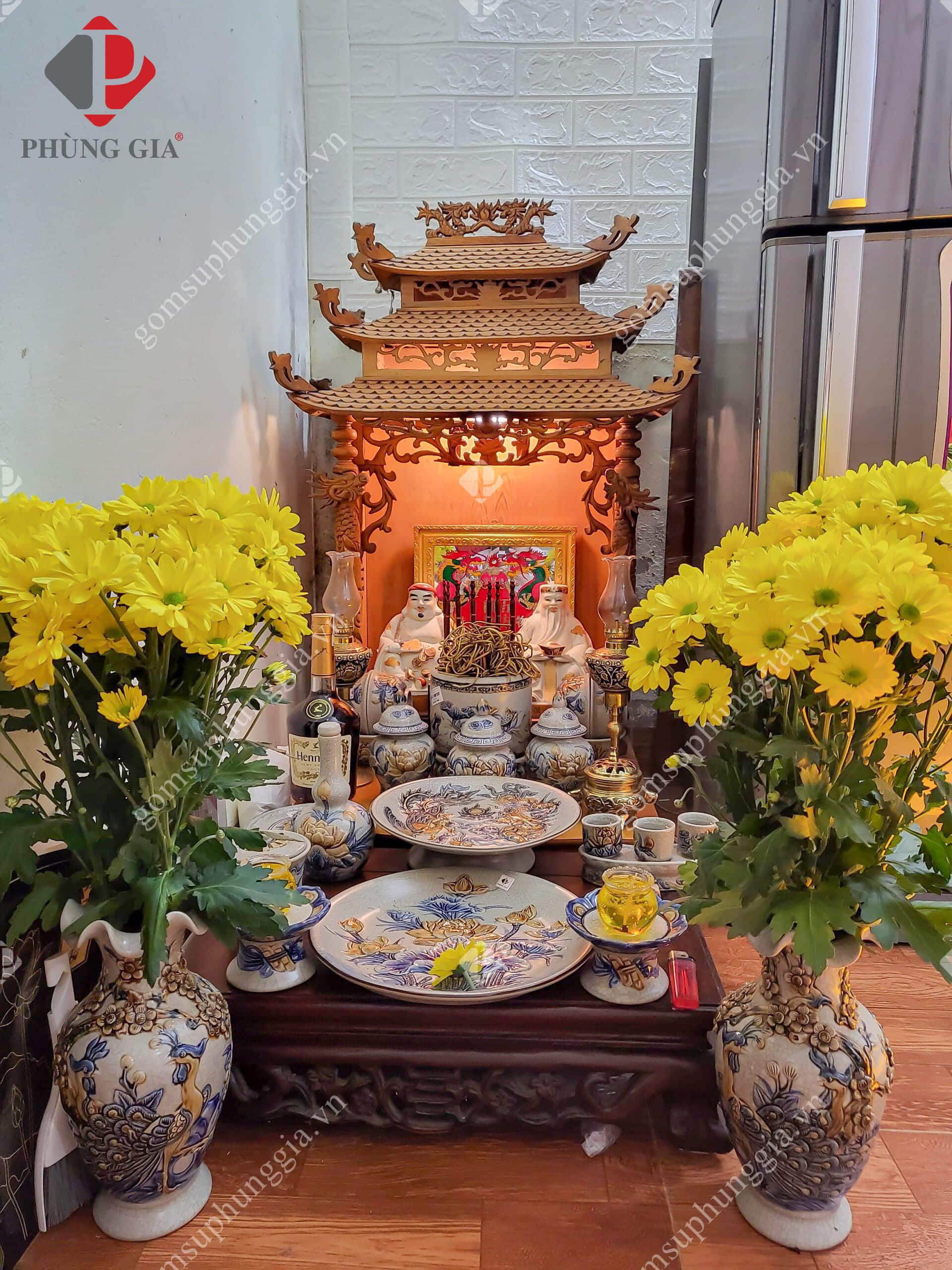 Bộ đồ thờ men rạn đắp nổi tại tư gia khách hàng Phùng Gia.