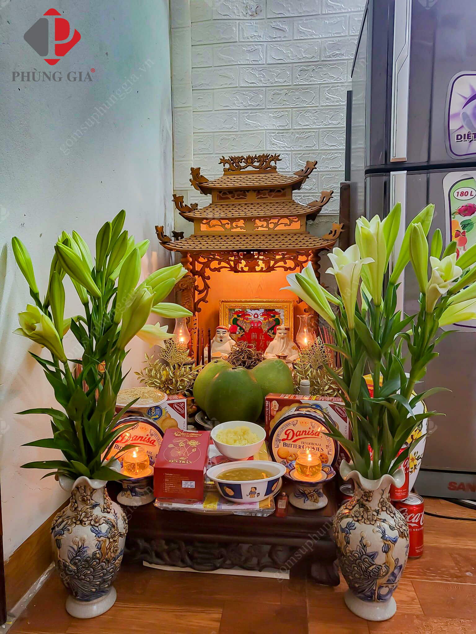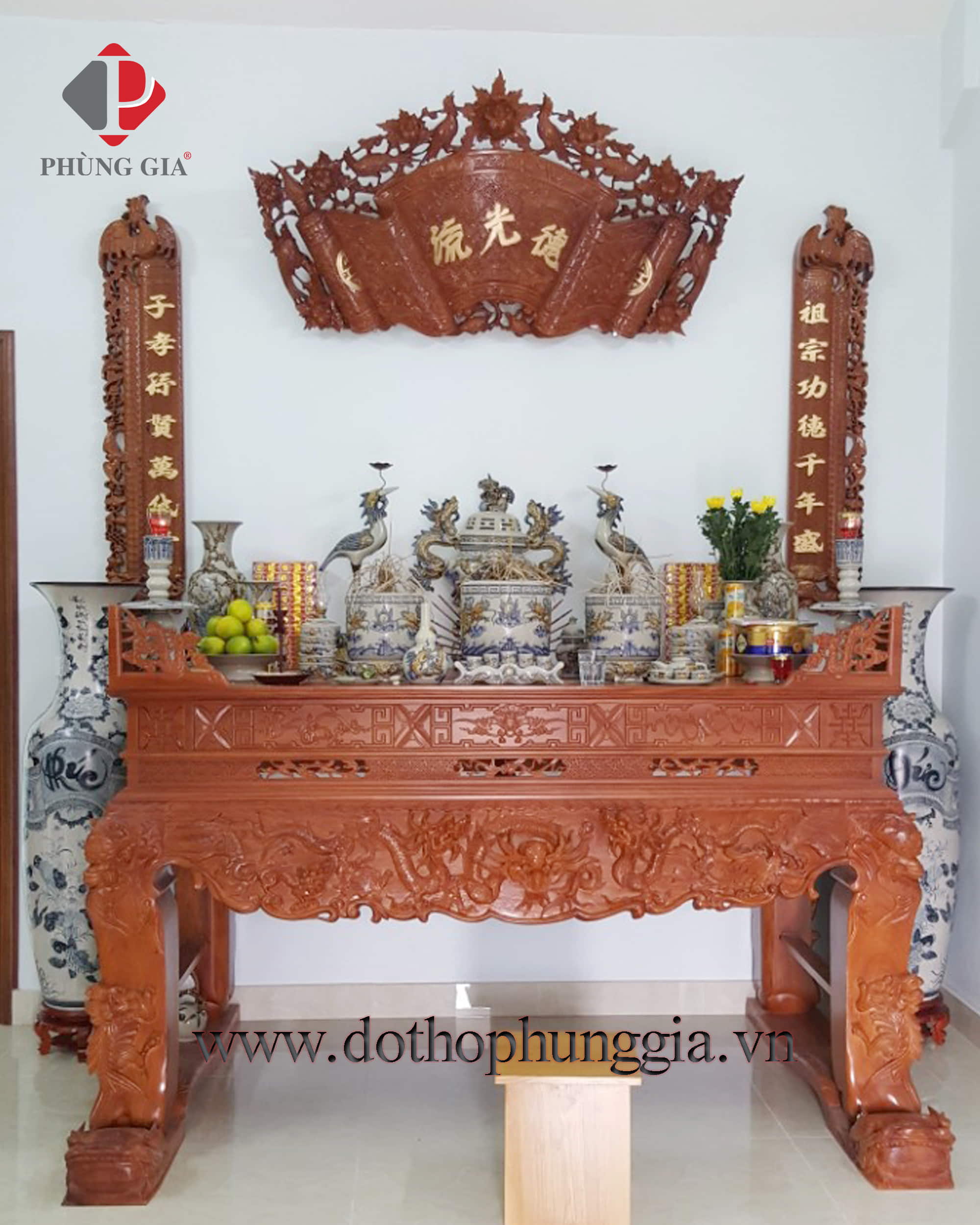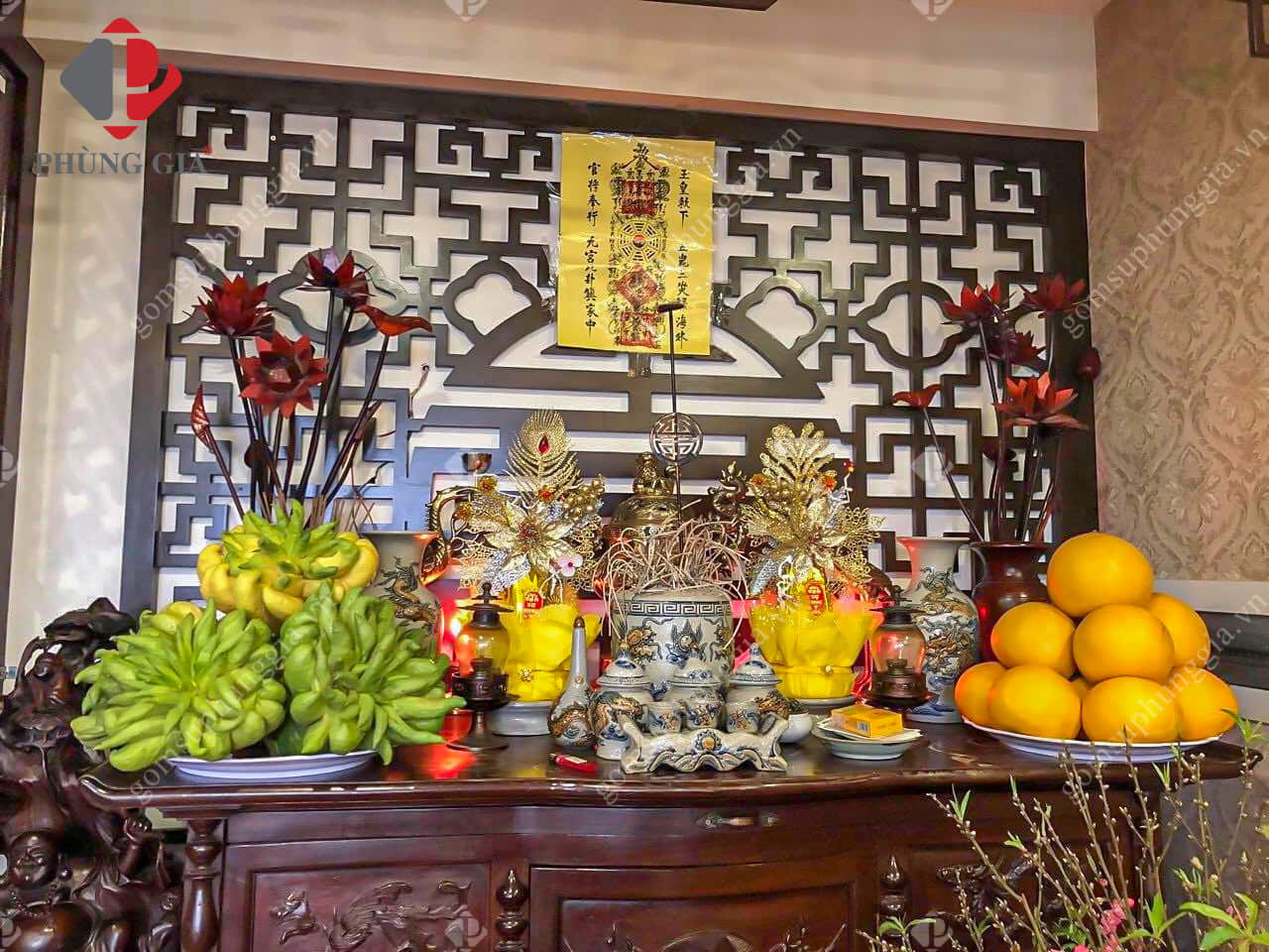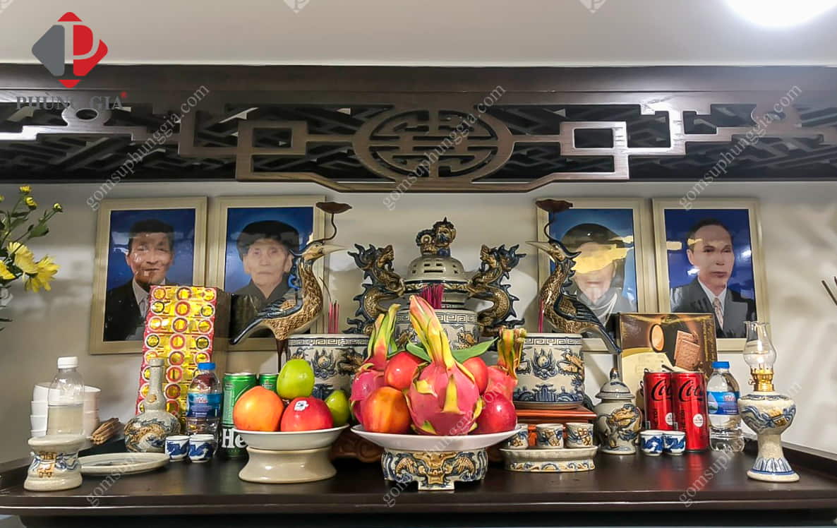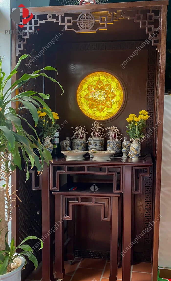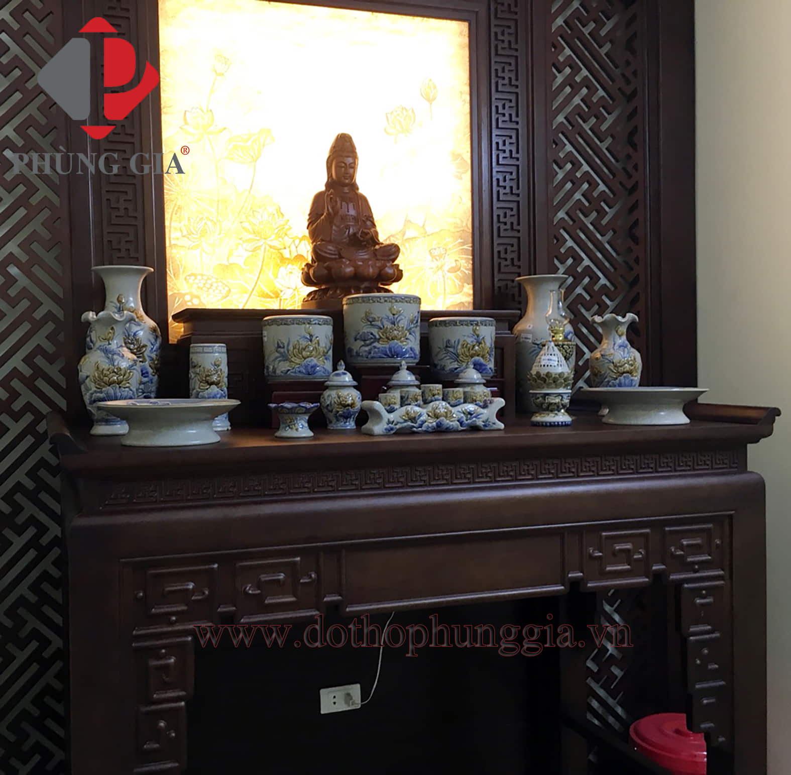 Bộ đồ thờ men rạn đắp nổi tại tư gia khách hàng Phùng Gia.
