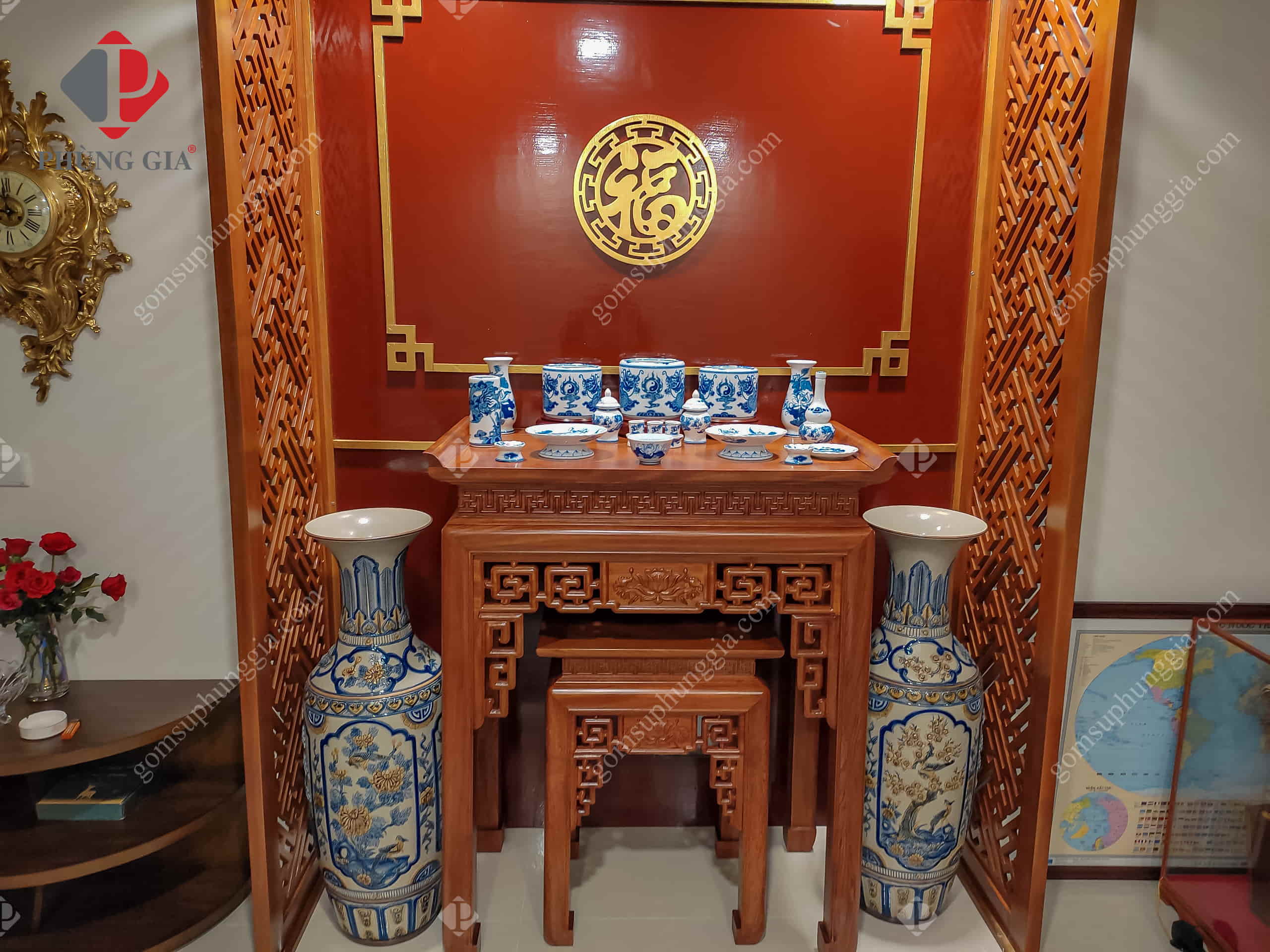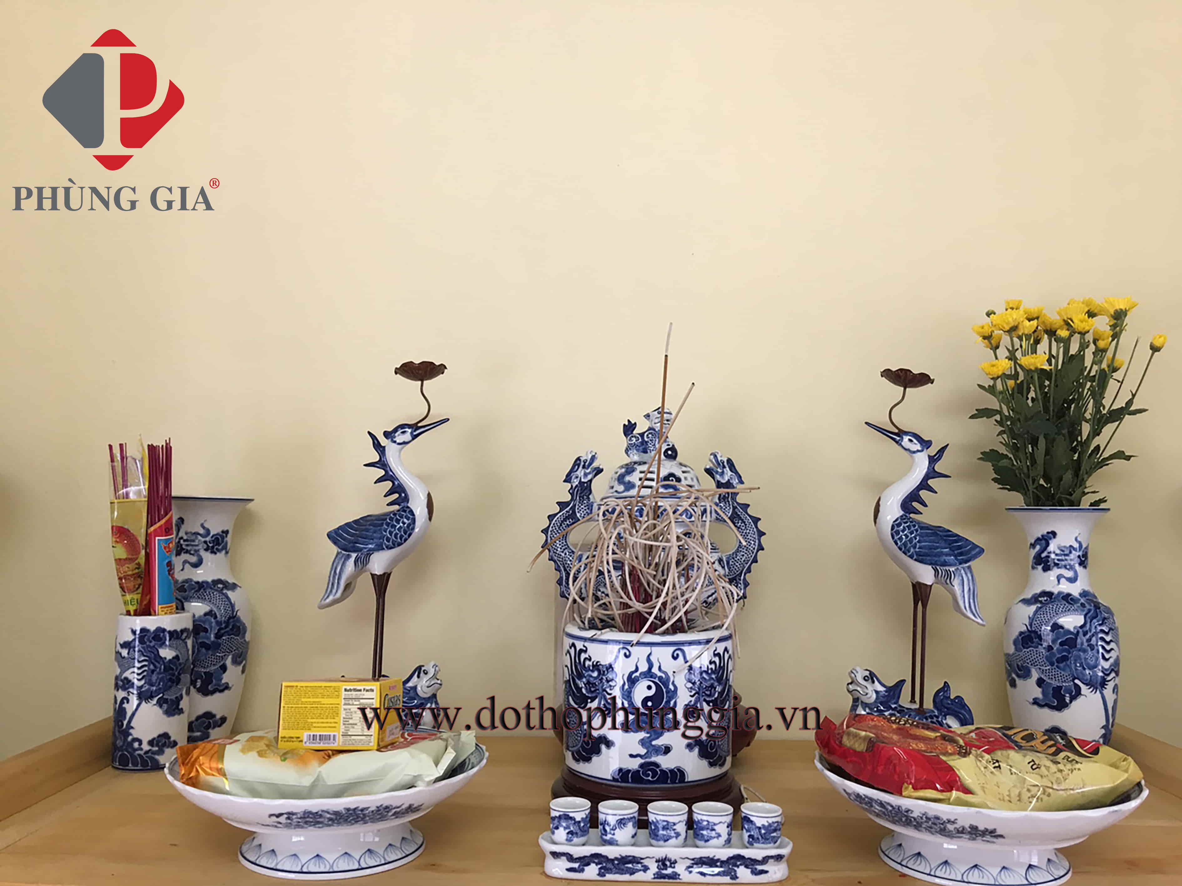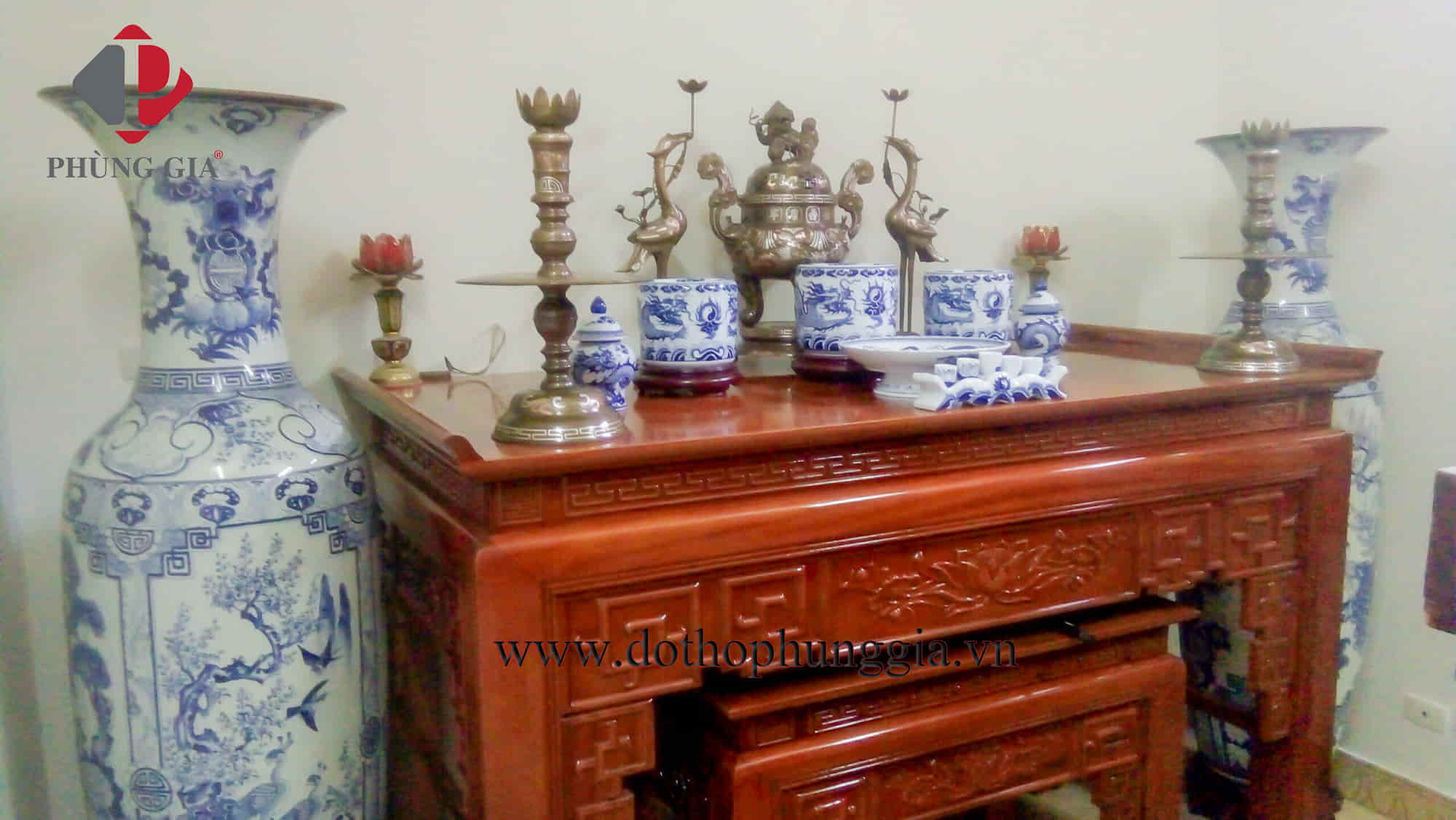 Đồ thờ men lam trắng tại tư gia khách hàng Phùng Gia: