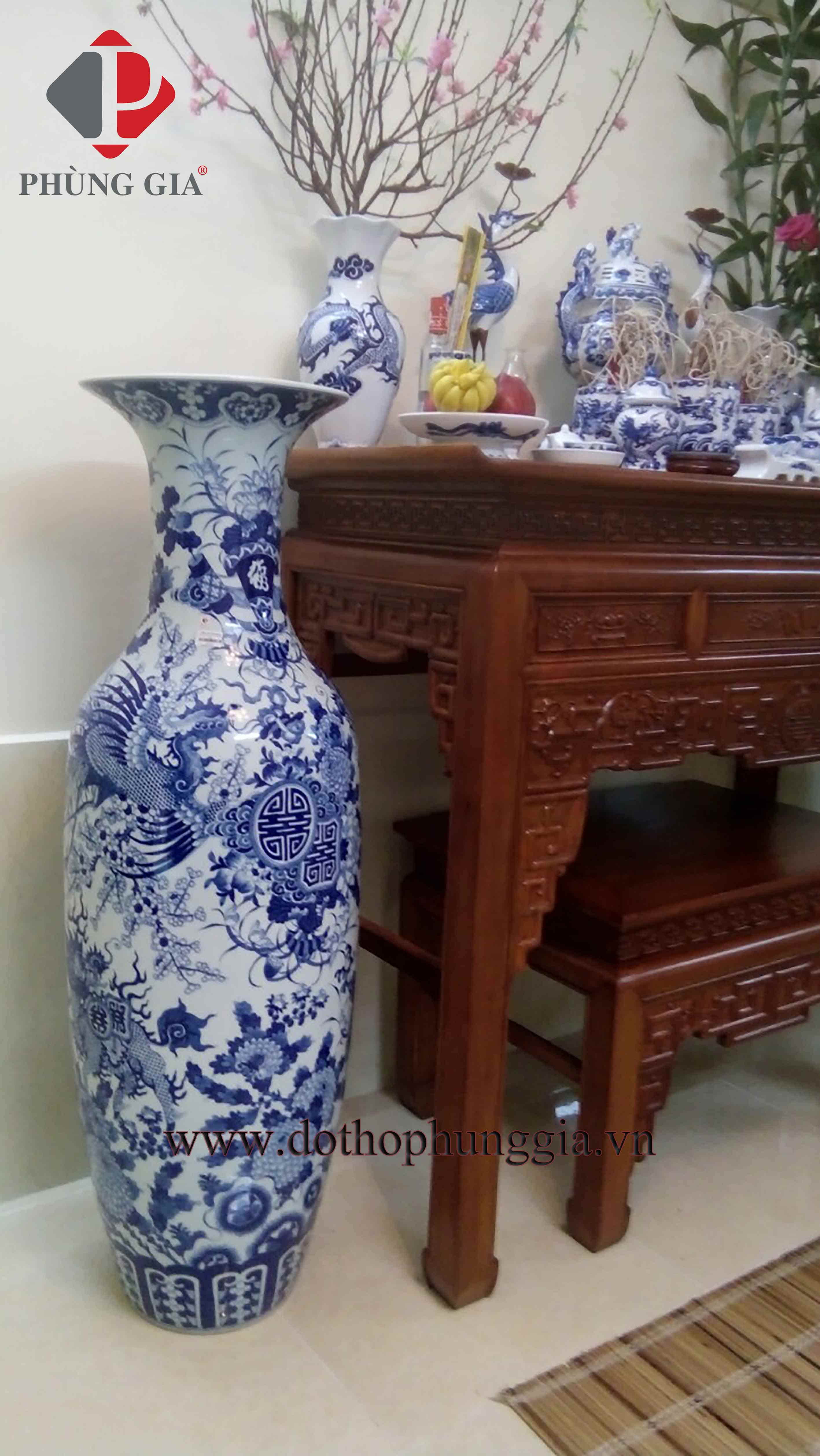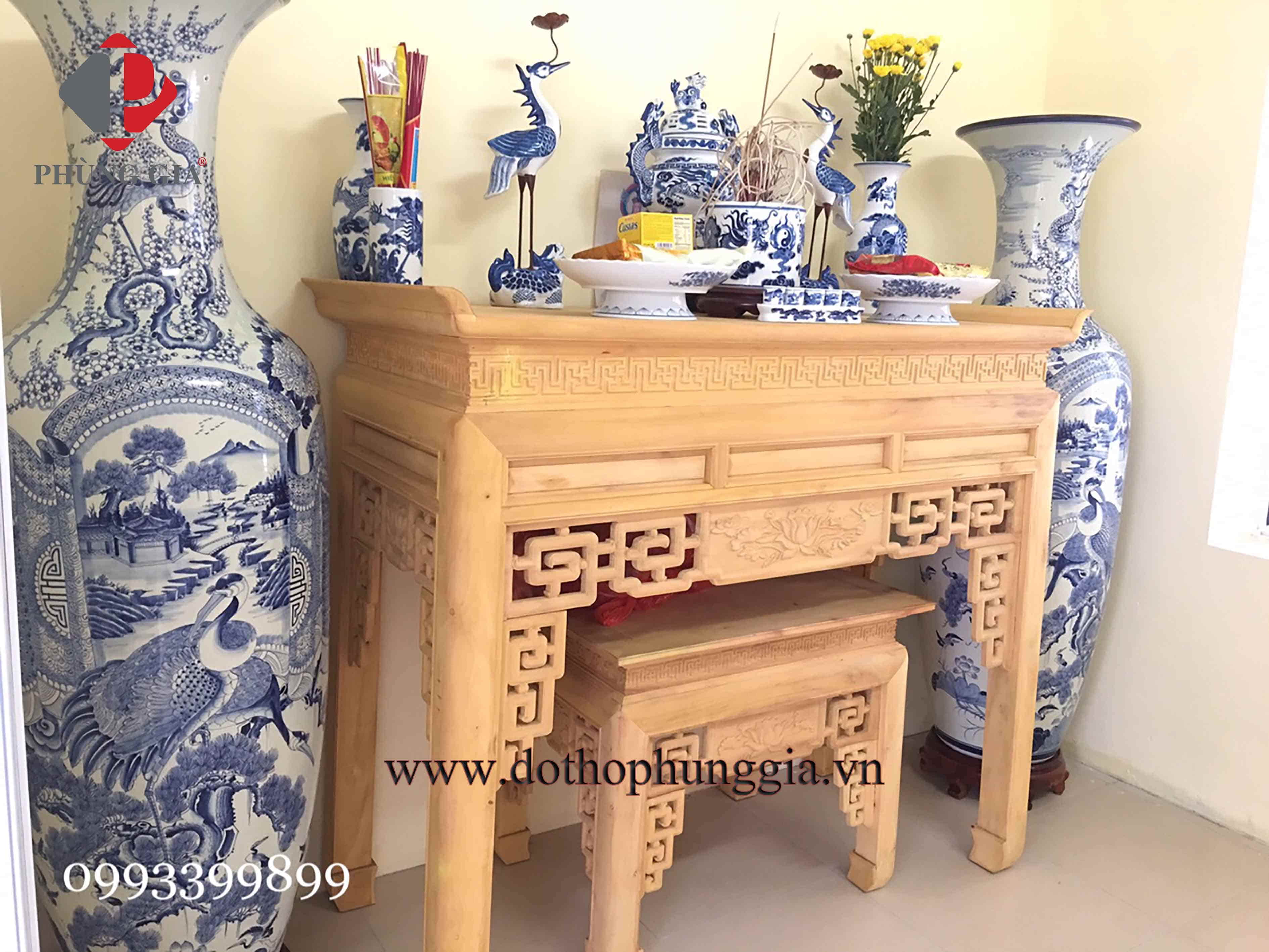 Bộ đồ thờ men lam trắng trơn & lộc bình Phúc Đức 1m6 vẽ tay men xanh ngọc - Tư Gia chị Tuyết - Phú Thuỵ, Gia Lâm, HN