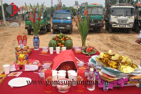 Trước giờ khởi công, gia chủ sắm biện lễ vật, thường gồm: hương hoa, trầu quả , tiền vàng, rượu thịt… đặt lễ lên mâm có kê đôn tại khu đát xây dựng để làm lễ.