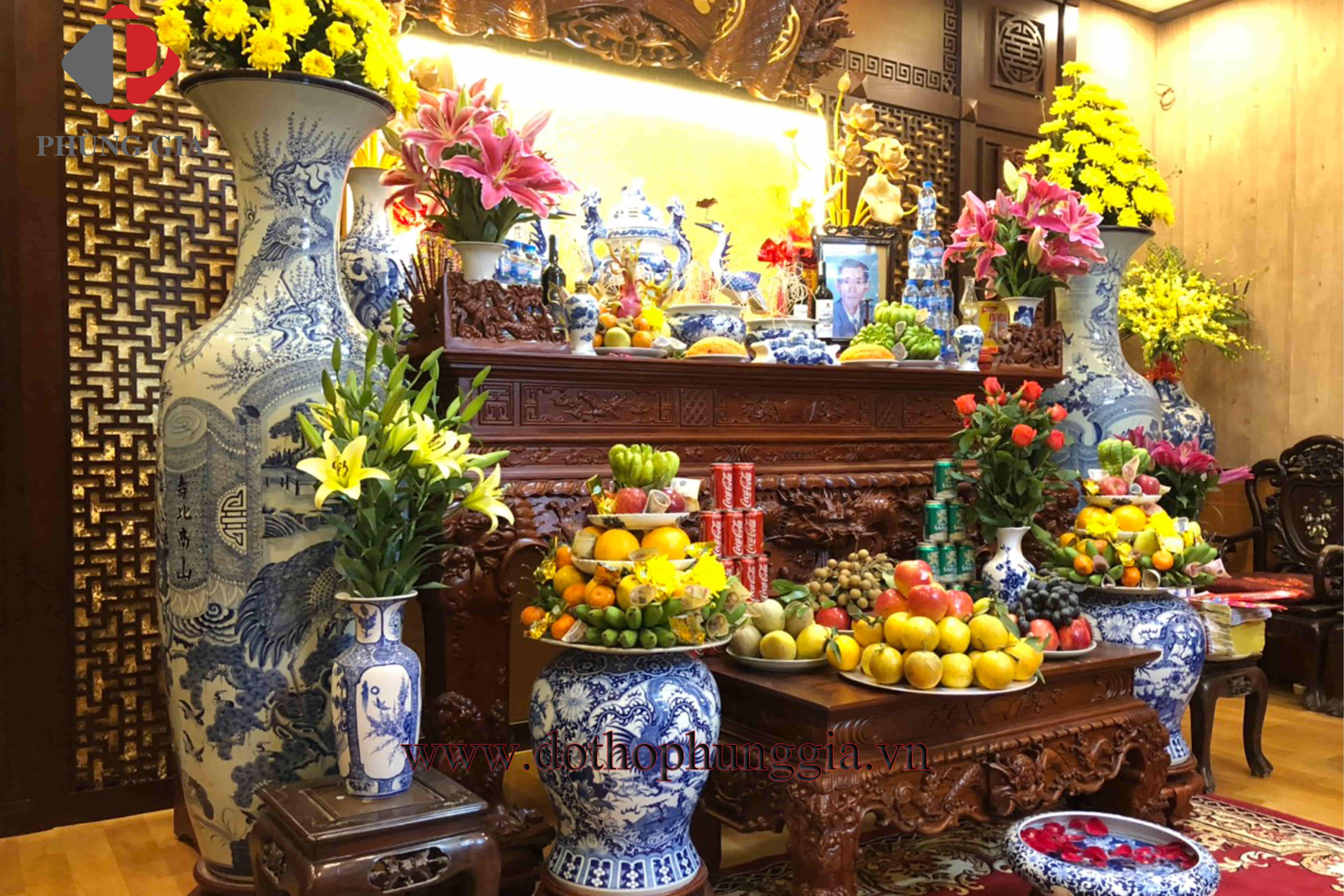 - Tranh trúc chỉ kết hợp đồ thờ men trắng xanh vẽ tay.