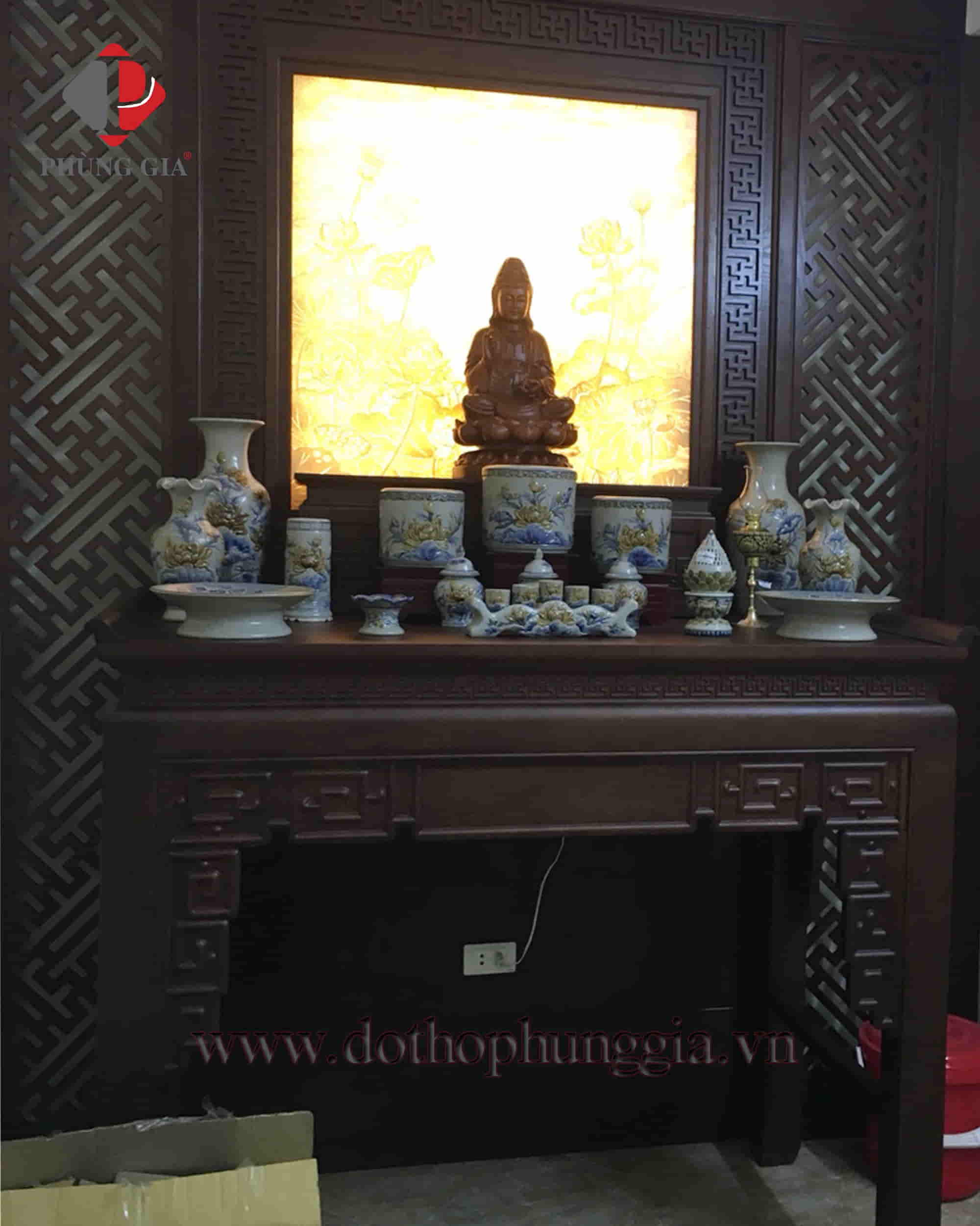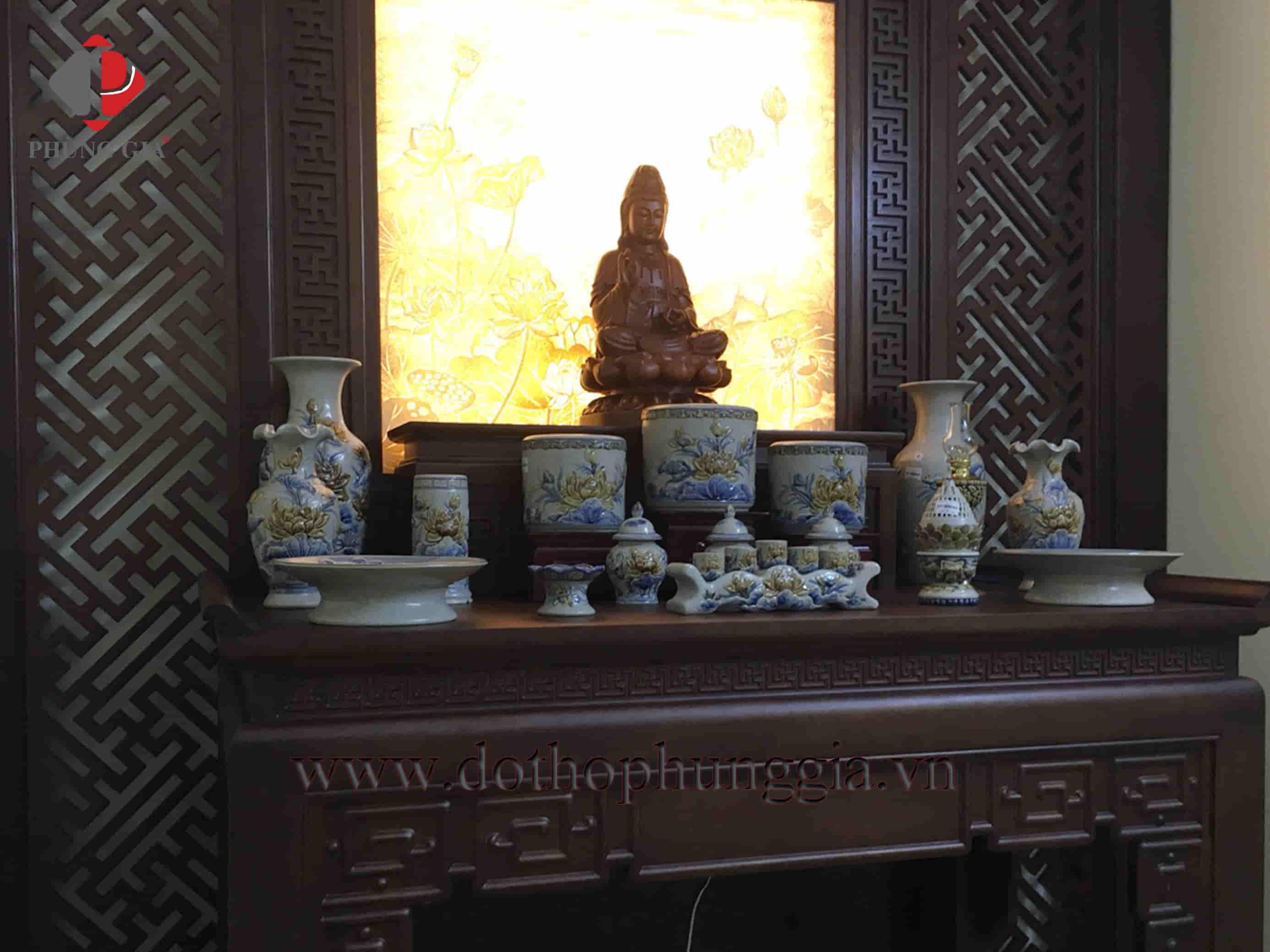- Đồ thờ men lam trắng nổi vẽ tay kết hợp tranh trúc chỉ tròn và chữ nhật.