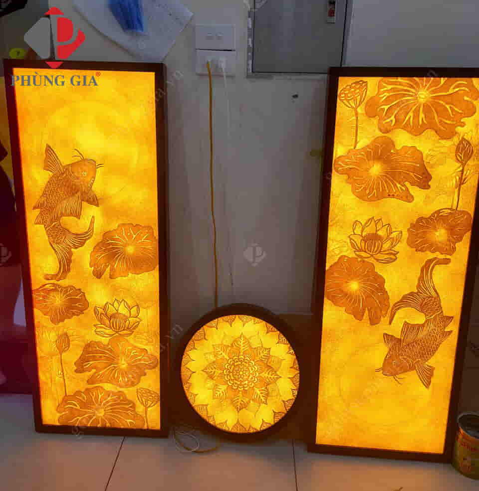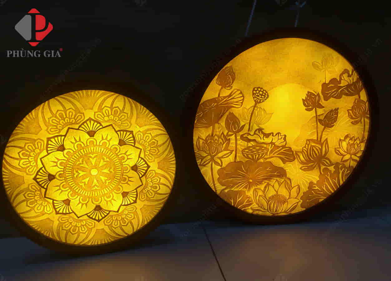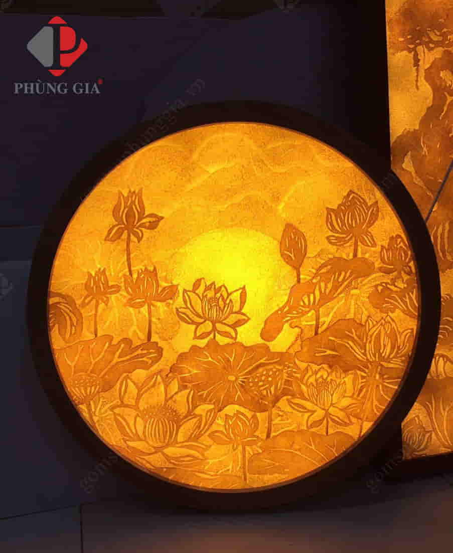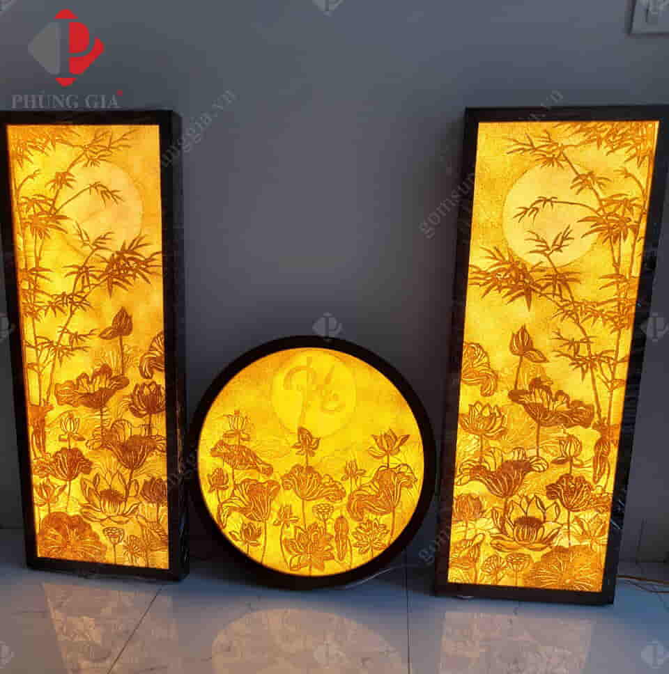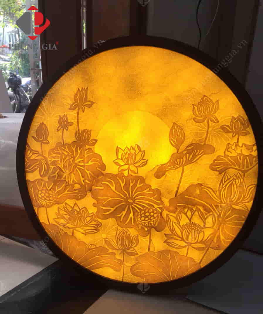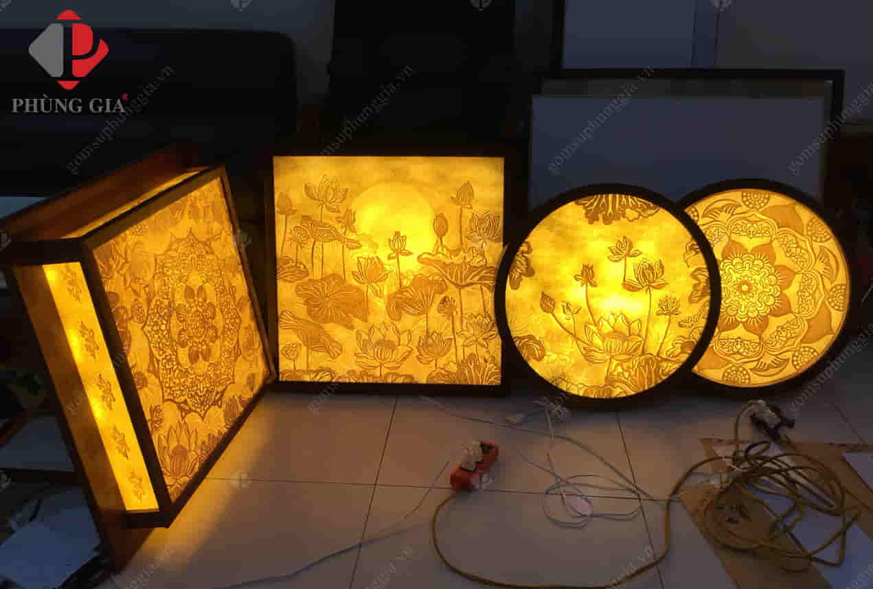 - Kích thước: Tranh được thiết kế với 3 kiểu dáng chính là tranh tròn, tranh vuông (hoặc chữ nhật) và đèn tranh.