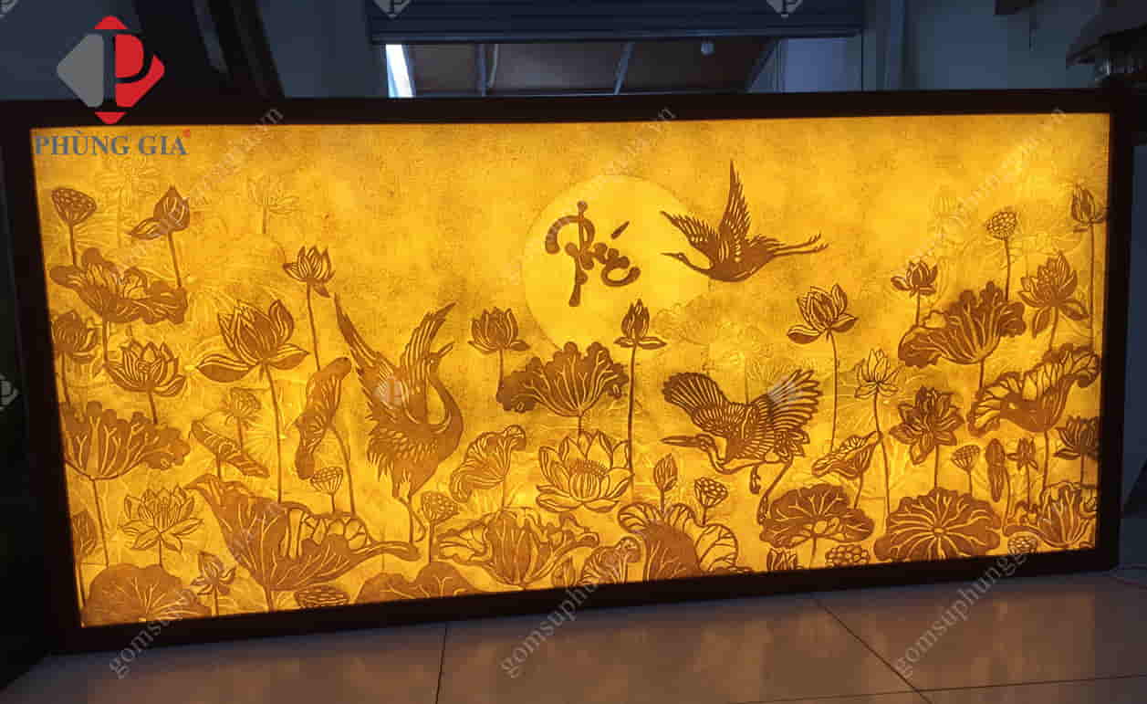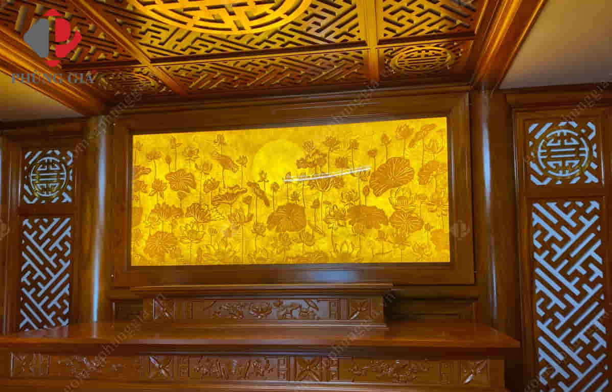 - Tranh trúc chỉ hoa sen: Với người Việt, hoa sen là quốc hoa, loài hoa thuần khiết, thanh tịnh và “trong sạch”. Do đó, loài hoa này thường được xuất hiện ở chùa chiền, vị trí an tọa của tượng Phật. Loài hoa này luôn mang đến cho con người cảm giác gần gũi và mà thanh khiết, giúp thanh lọc tâm hồn, định hướng con người đến với sự từ bi, giác ngộ và giữ vững được sự lương thiện trong mỗi con người. Họa tiết vẽ tay thủ công với họa tiết hoa sen kết hợp với hình ảnh cá chép, tranh hoa sen dưới ánh trăng, song hạc trong đầm sen,…. Tất cả đều thể hiện được sự sang trọng, tôn nghiêm.
