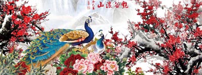 Cảnh vẽ gồm: Chim Công - Hoa Đào - Mẫu Đơn